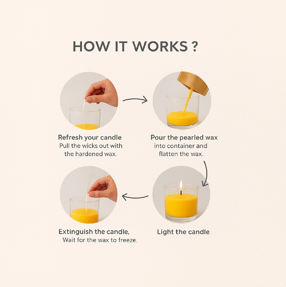 For safe and optimal use, spread the pearled wax beads and keep the wicks around the center of a heat-resistant, flat bottom container before lighting. Keep the candle away from flammable objects, drafts, and out of reach of children and pets. Never leave a burning candle unattended. Allow the wax to solidify before moving or relighting. Store in a cool, dry place away from direct sunlight to preserve fragrance and quality.