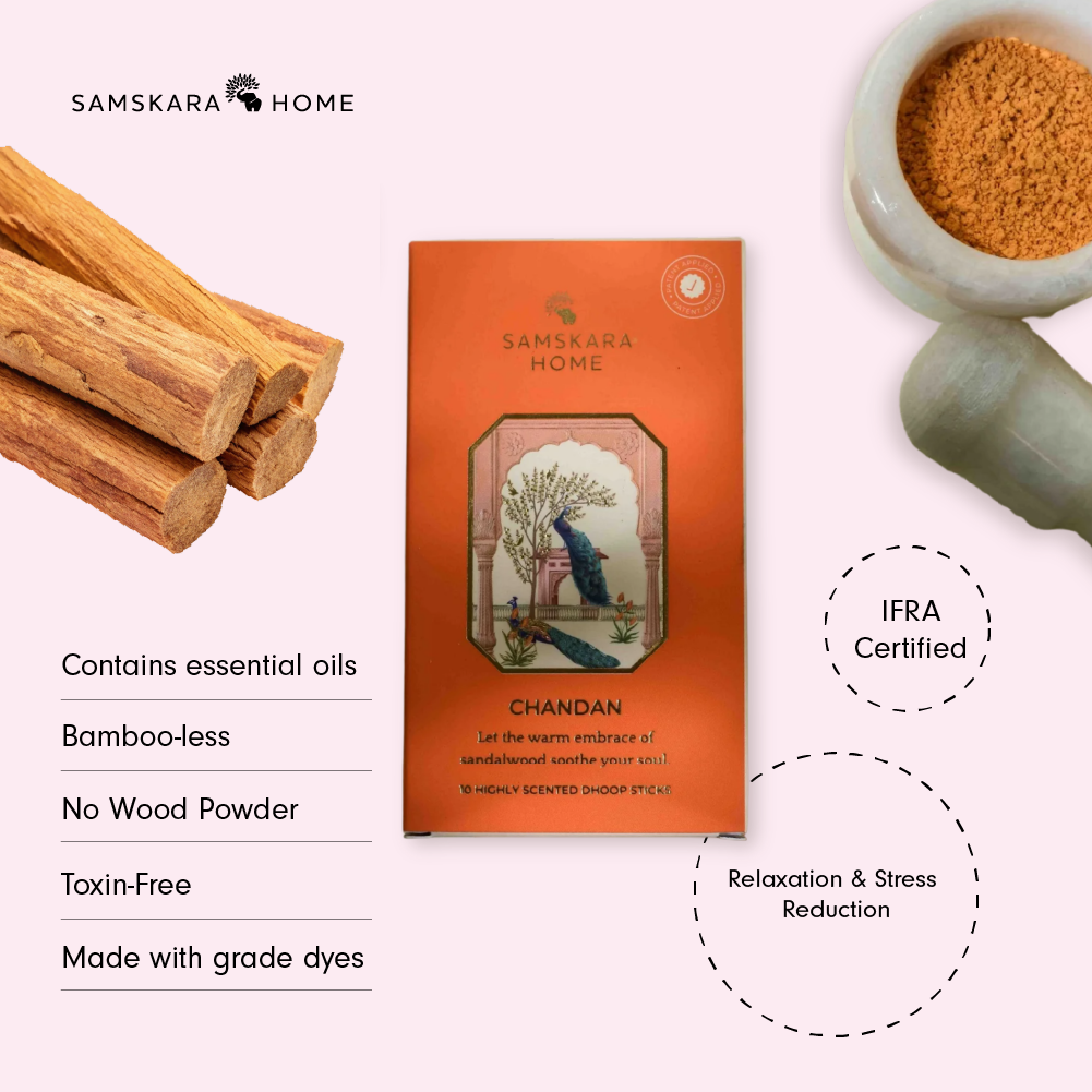 "Samskara Home's Chandan Dhoop Sticks will transport you to a realm of beautiful scents. As the delicate tendrils of sandalwood essence fill the air, immerse yourself in the warm embrace of natural smells. These dhoop sticks are a wonderful blend of tradition and contemporary, handcrafted with precision and care. Chandan's lush and woody notes take you to an ethereal realm of tranquillity and harmony.